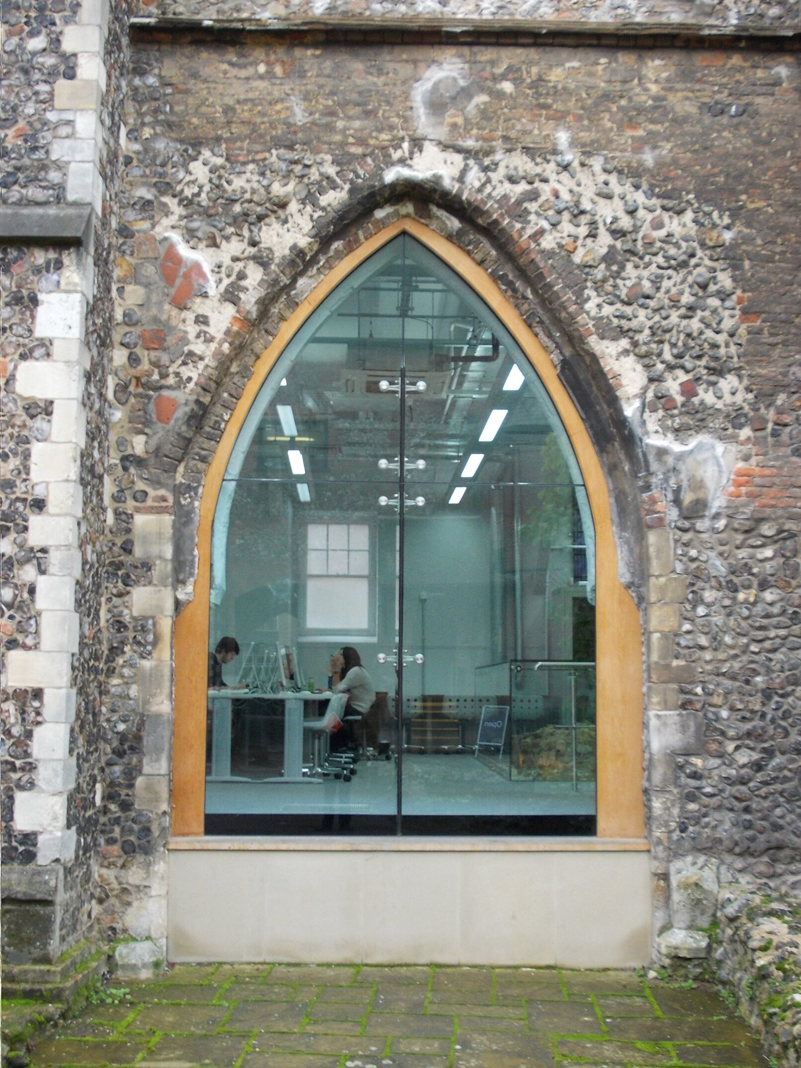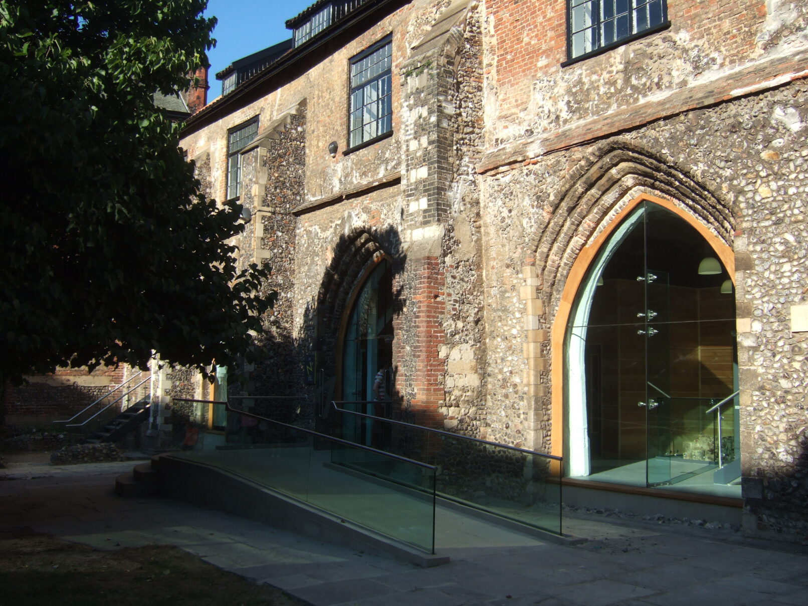 The building forms part of the medieval St Andrews Hall complex in Norwich and was the former dormitory for the monks. Prior to the works the building was in a dilapidated condition and had been used as gallery exhibition space. Purslows produced a scheme to convert the building for use for the photography department of a university. Externally, poor quality brick and timber glazed infill to the original cloister arches were replaced with frameless glazing and a Yorkstone and glass ramp and steps were constructed to provide disabled access into the building. Internally a new staircase and lift were installed along with office ‘pods’ a digital darkroom and photography studio. Ruins uncovered as part of the works were preserved and protected in glass boxes.