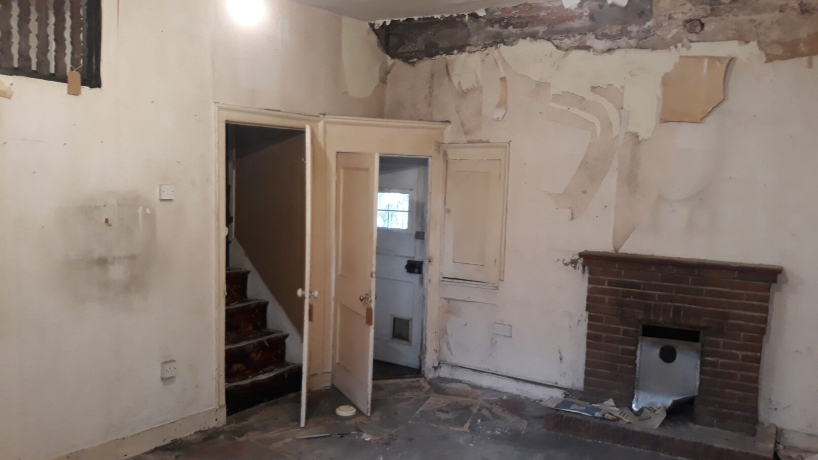 Traditional repair methods were utilised such as limecrete flooring and lime plasters and renders to avoid the need for modern damp proofing. Previously hidden historic building features were uncovered during the works including former door and window openings, historic wallpaper and a fire surround.